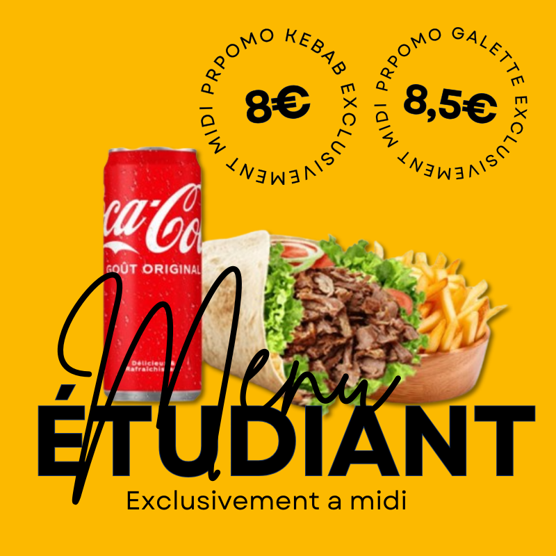 Original Kebab | 7,00€ | Bœuf (et) ou poulet, salade, tomates, oignons, choux rouge, sauce au choix.Galette Kebab | 7,50€ | Bœuf (et) ou poulet, salade, tomates, oignons, choux rouge, sauce au choix.Maxi Galette | 11,00€ | Bœuf (et) ou poulet, salade, tomates, oignons, choux rouge, sauce au choix.Cheeseburger | 5,50€ | Steak de Bœuf, cheddar, salade, tomates, oignons, choux rouge, sauce au choix.Galette Tenders | 7,50€ | Tenders de poulet, salade, tomates, oignons, choux rouge, sauce au choix.Mexicanos | 5,00€ | Viande de mexicanos, salade, tomates, oignons, choux rouge, sauce au choix.Brochette | 7,50€ | Brochette au poulet, salade, tomates, oignons, choux rouge, sauce au choix.Menu enfant | 7,00€ | Nugget ou fricadelle ou kebab, frite, caprisunLibanais | 8,00€ | Bœuf (et) ou poulet, cheddar, salade, tomates, oignons, choux rouge, sauce au choix.Fricadelle | 5,00€ | Viande de fricadelle, salade, tomates, oignons, choux rouge, sauce au choix.Kefta | 7,50€ | Boulette de bœuf haché avec persil et épices, salade, tomates, oignons, choux rouge, sauce au choix.Thon | 4,00€ | Tartinade de thon, salade, tomates, oignons, choux rouge, sauce au choix.Merguez | 6,50€ | Merguez, salade, tomates, oignons, choux rouge, sauce au choix.Menu étudiant | Bœuf (et) ou poulet, salade, tomates, oignons, choux rouge, sauce au choix.