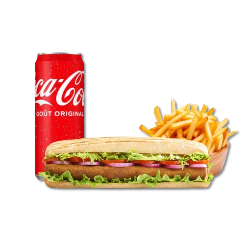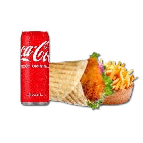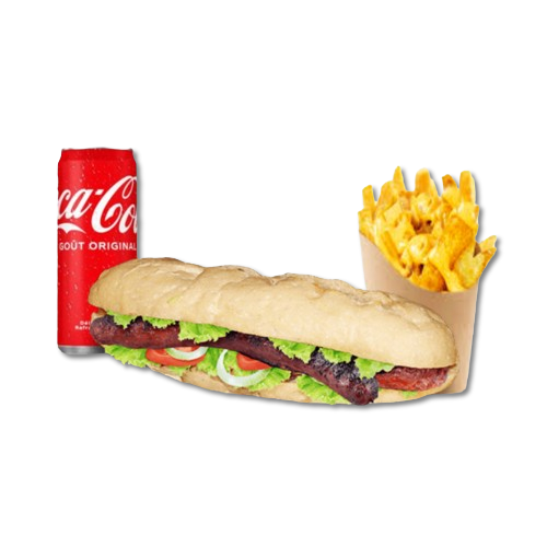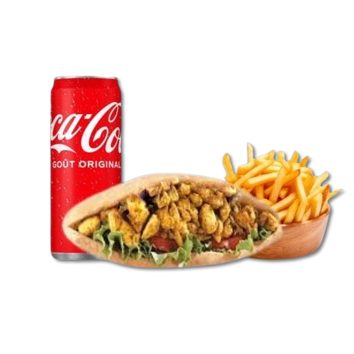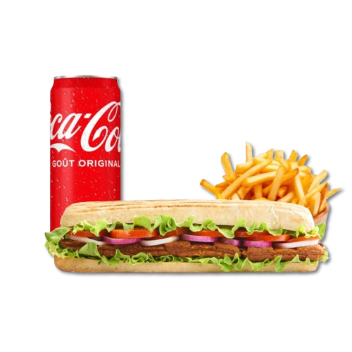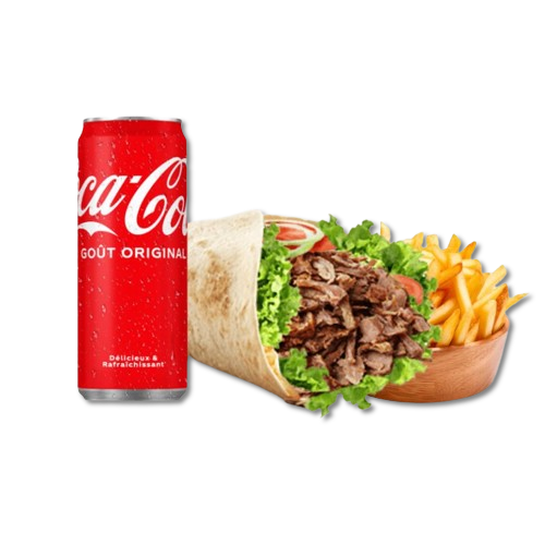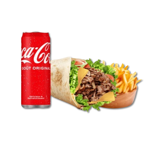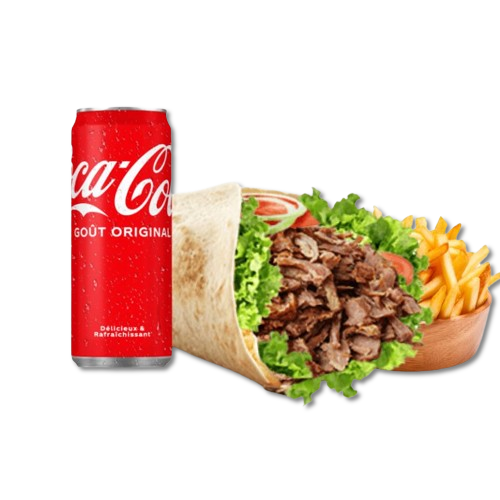 Le format de sandwich ou assiette, bœuf (et) ou poulet, avec ou sans crudités (salade, tomates, oignons, choux rouge) la sauce, la boisson, en menu ou simple.